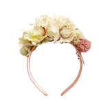 Made of satin bases, I design our whimsical pieces with a mixture of pom poms, sequins, birds, silk flowers, greek charms and swarovski crystals.