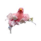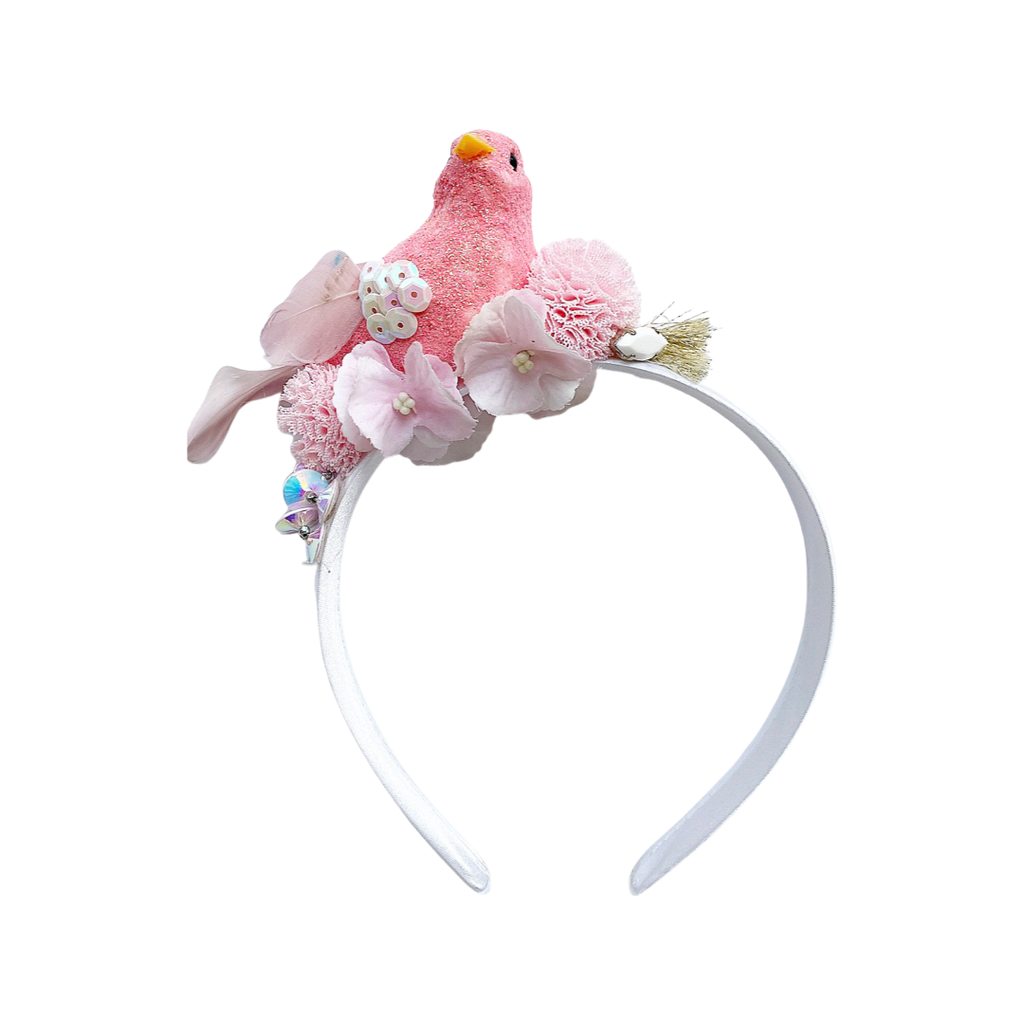 Made of satin bases, I design our whimsical pieces with a mixture of pom poms, sequins, birds, silk flowers, greek charms and swarovski crystals.