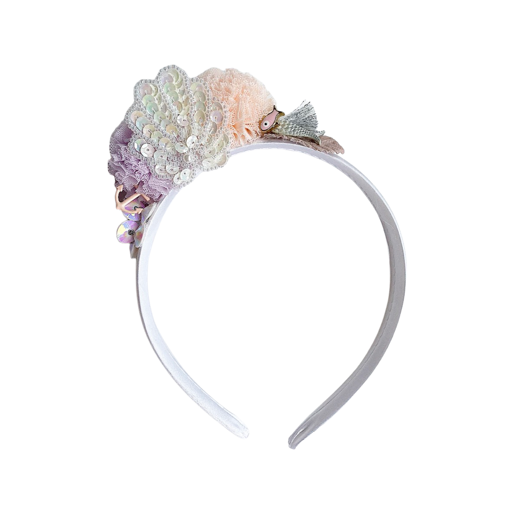 Made of satin bases, I design our whimsical pieces with a mixture of pom poms, sequins, birds, silk flowers, greek charms and swarovski crystals.