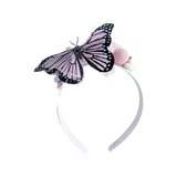 Made of satin bases, I design our whimsical pieces with a mixture of pom poms, butterflies, sequins, birds, silk flowers, greek charms and swarovski crystals.